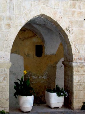 Crusaders, who were in the land in the 12th and 13th centuries, took the arch and pulled it up in the middle to create a pointed arch. Like the arch (above) from a courtyard on Mt. Zion. There are no pointed arches before this time though of course the shape was copied later, and may be the beginning of Gothic architecture.